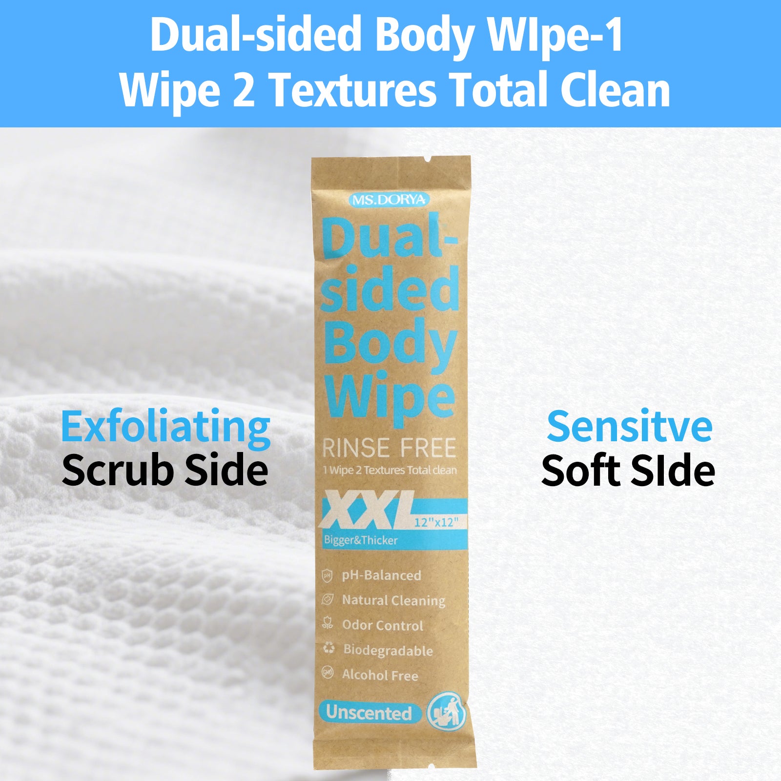 Our extra-large (12” x 12”) wipes offer full-body coverage and durability. The dual-sided texture includes a gently exfoliating side for deep cleansing and a smooth side for sensitive skin—ideal for no-rinse use anywhere.